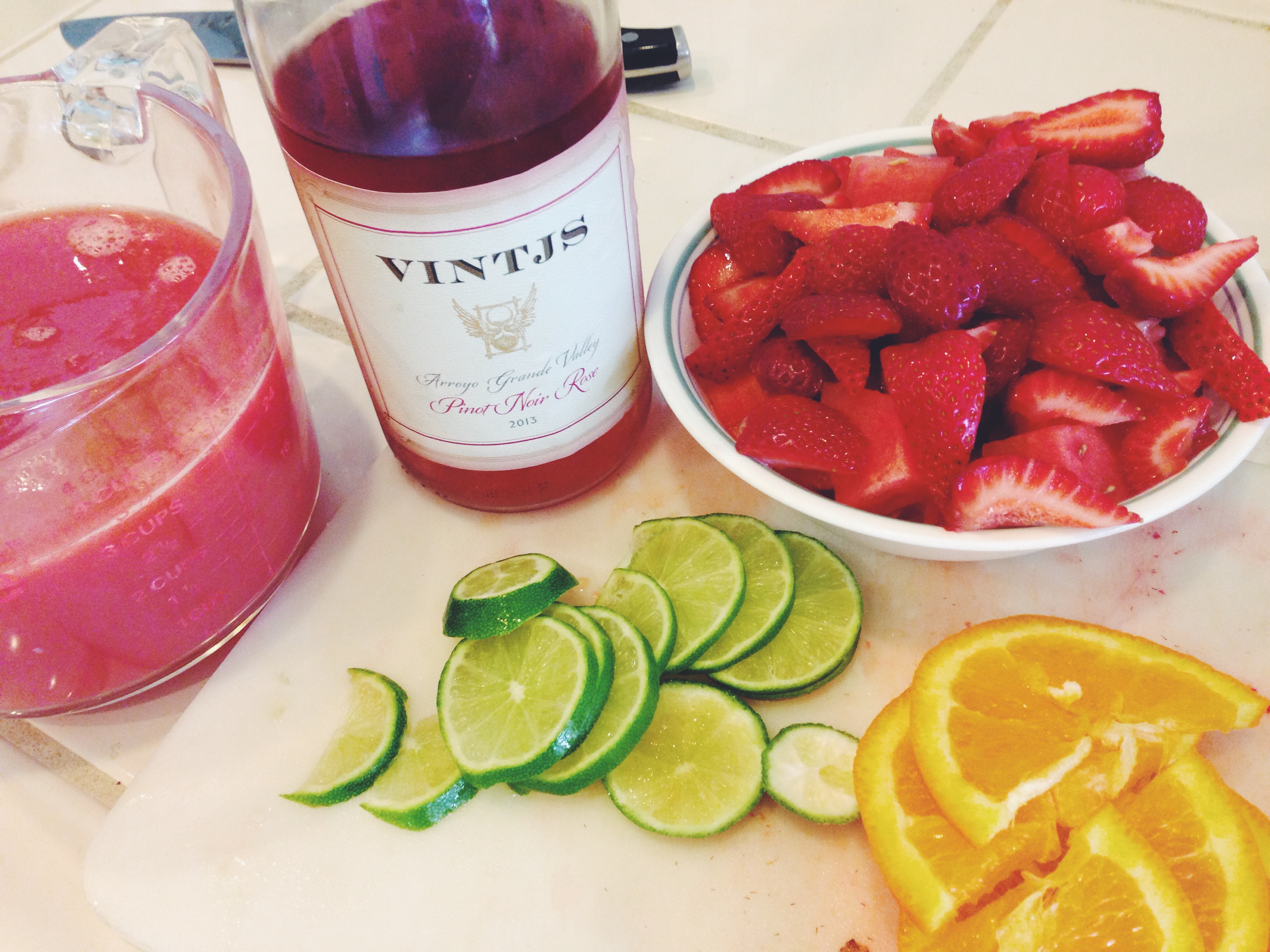 Step 3 – Muddle another handful of strawberries in the bottom of a big pitcher. (Seriously, make sure it’s large enough to hold a good 8 cups of liquid and generous amounts of fruit. Otherwise, you’ll have to do what we did and transfer your concoction to two smaller pitchers later on.) Pour all your liquids into the giant pitcher – watermelon-strawberry juice, wine, vodka, Cointreau, orange juice, and lime juice – and stir together. Then stir in the remaining sliced fruit: strawberries, watermelon, oranges, and lime. It’s going to look just beautiful.